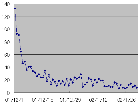 たまに、こんな話を聞くことがあります。 「届いたメールに変な添付ファイルが付いてて、なんとなく実行しちゃったんだけど、ちょっと心配。別に何も起きなかったから大丈夫だと思うんだけど」。 …それは、けっこうな確率でコンピュータ・ウイルスに感染していると思います。 そして、ウイルスは「感染したパソコンの中に保存されているメールアドレス」を見つけては手当たり次第に自分のコピーを送りつけます。 つまり、読んだホームページの管理人やメール友達のところに、自分のパソコンからウイルスメールが送り込まれている可能性があるわけです。被害を受けるのは自分ではなく他人なので、早めに対処しましょう。 なお、何の対策もせずに「アウトルック」「アウトルックエクスプレス」を使っていると、別に怪しい添付ファイルを実行しなくても、メールを読むだけで感染します。 IE5.01を使っておられる方は、こちらのサービスパックをインストールしてください。 そういえば、その対策をしていなかった島さとし衆議院議員が、“読むだけウイルス”にあっさりと感染。事務所のパソコンからウイルスメールをバラまいたことがありました。 島先生は、これを「悪意を持った何者かがウイルスを送り込んできたサイバーテロ」と判断。「サイバーテロ根絶のために断固戦うぞ」と決意を表明しておられました。 もちろん、そんなの全然サイバーテロではなく、島先生のようなド素人ユーザーさんを中心に、人から人へ広まっているだけ。無知もいいところです。 そんな島先生、“政界一のIT通”、“インターネット通”を自称しておられますが、せめてウロンちゃんの12月24日の意味が理解できるようになってから名乗って欲しいと思います。 さて。 「W32/BADTRANS−B」というウイルスがあります。 「感染に使われるメールは件名が「Re:」だけ」という分かりやすい特徴を持ち、万が一感染してもこちらの修復ツールで対処できるものです。 これが昨年11月の終わりごろに大流行。せっかくなので、12月から1月にかけて、ちゆのアドレスに届いた「Re:」メールの数を集計してみました。
