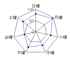 勢いがあったのはウイルス発生から1週間程度で、すぐに落ち着きました。以降は、少しずつ減少しながら、それなりに安定したウイルス供給が続いています。 ついでに曜日別の傾向を見出せないかと思ったのが、次のグラフです。