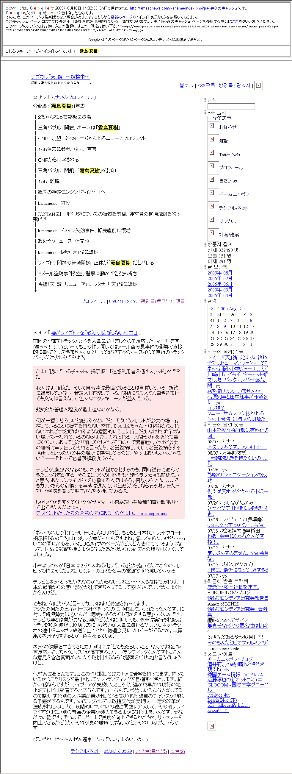 | ここからのキバヤシの台詞は、夏樹さんのブログ閉鎖を受けて、阿修羅掲示板に投稿された感想を元にしました。 |