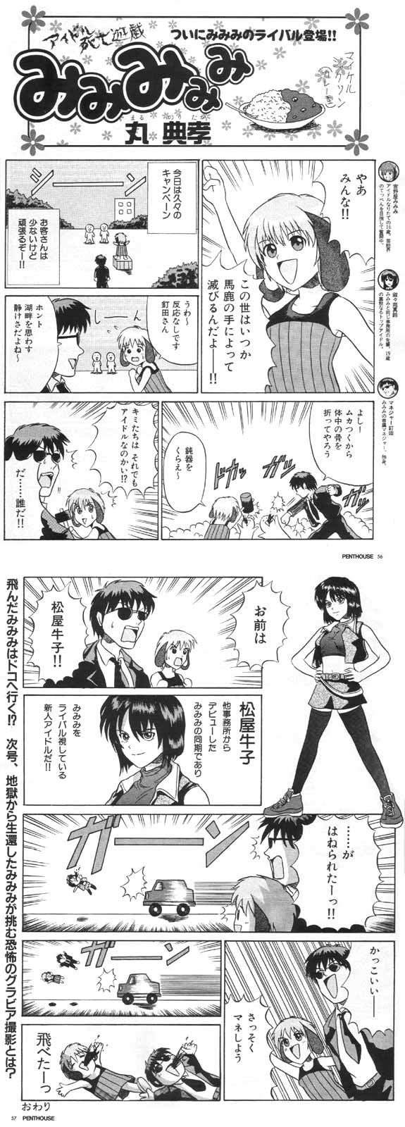 さて。そんな「ペントハウス」今月号から、なぜかちゆの漫画も連載させて頂いております。と言っても別にエロ漫画ではなく、いつもの「ちゆニュース」を1ページの漫画にした感じのものです。 正直、書いている自分でもあまり面白くない気がしますけれど…。まだ「B−GEEKS」に連載中の「ちゆまんが大王」の方がマシかも知れません。 ともあれ、この「ペントハウス」誌上には、ちゆよりも先に強力な2次元アイドルが存在していました。 名前はみみみちゃん。漫画「アイドル死亡遊戯みみみみみ」のヒロインで、アイドルなりたての16歳だそうです。