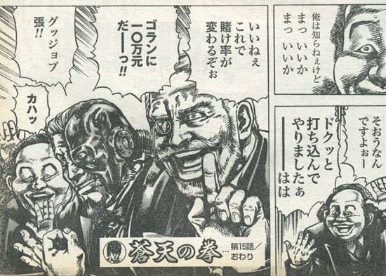 さて、ちゆの記憶が正しければ、11年前には、このような形での「グッジョブ」は使われていませんでした。 (元は英語ですから皆無ではないかも知れませんが、90年代のパソコン通信や初期の2ちゃんねるのログからは、「グッジョブ」という発言はほとんど見つけられないと思います) 2ちゃんねるで「グッジョブ」が使われ出したのは、2001年の9月。 「コミックバンチ」の2001年17号(9月4日発売)に掲載された「蒼天の拳」がはじまりでした。