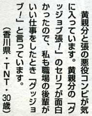 | 平成24年2月14日 | ネットスラングとしての「グッジョブ」の発祥は『蒼天の拳』ということで良いですか? | ||||||||||||||||||||||||||||||||||||||||||||||||||||||