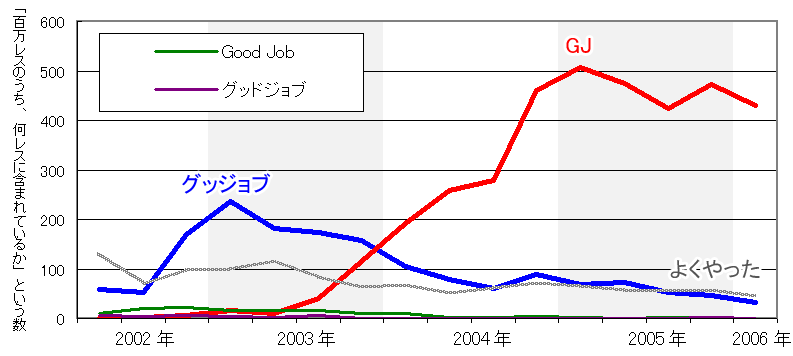 その言葉を含む発言が多い時期には、グラフが上に伸びます。 つまり、少なくともアニメの実況では、 ●2002年ごろは、「GJ」という略語が使われることは極めて少なかった ●2003年までは、「GJ」という略語よりも、カタカナでの「グッジョブ」が多かった ●2003年の途中から「GJ」という略語が使われることが増えていき、カタカナの「グッジョブ」は少しづつ減っていった ……ということが読み取れます。 続きを読む |