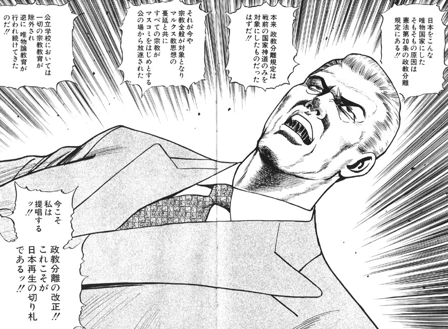 総理が言うには、「さまざまな事件・事故・凶悪犯罪…(中略)これらの混迷の共通点は ごく普通に日本の教育を受けたはずの人々に『善悪とは何かが分からない』という事実ではないかッ!! これは日本が正しき宗教教育をして来なかったことに起因する!!」とのことで、