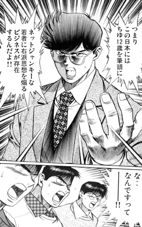 平成17年の3月ごろ、ネット上の言論に関して、とてもユニークな説が提唱されました。 それによると、「侍魂」や「ちゆ12歳」などのテキストサイトを作ったのは右翼企業で、「ネット右翼」というのは、その煽動工作に騙されたオタク系の若者たちなのだそうです。
